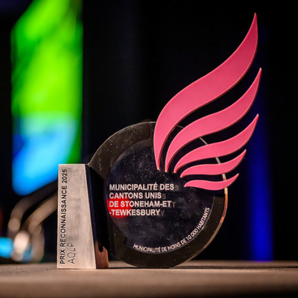 Le 8 octobre dernier, à l’occasion de la cérémonie des Prix de Reconnaissance AQLP (Association québécoise du loisir public), la délégation de la Municipalité, composée de membres du service des Loisirs, du directeur-général et greffier-trésorier et du maire de Stoneham-et-Tewkesbury, est montée sur la scène pour recevoir le trophée dans la catégorie Municipalité de moins de 10 000 habitants. Cette récompense souligne les améliorations participatives du parc des Fondateurs.