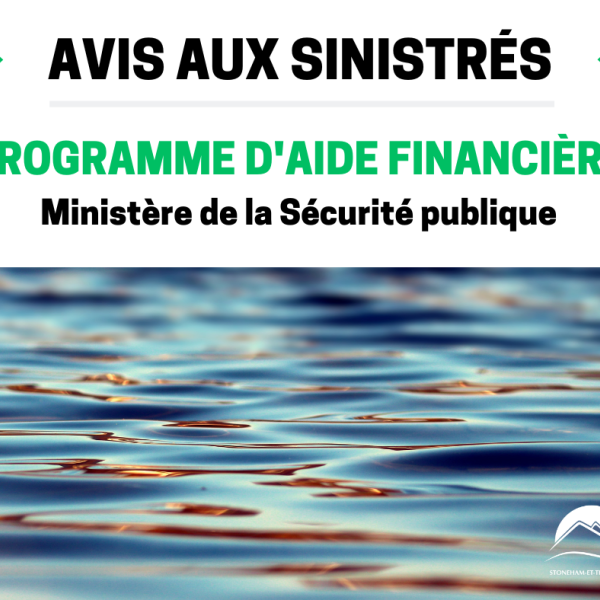 Tel qu'annoncé dans le communiqué du 12 juillet 2023, la Municipalité de Stoneham-et-Tewkesbury tient à informer ses citoyens touchés par les inondations du 10 et 11 juillet 2023 qu'ils vont pouvoir présenter une demande d'aide financière auprès du ministère de la Sécurité publique.