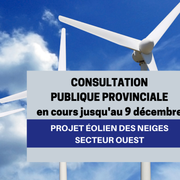 Une consultation publique sur les enjeux du projet éolien des Neiges – Secteur Ouest réalisée par Boralex inc. et Énergir S.E.C. dans la région administrative de la Capitale-Nationale (03) s’est amorcée le 10 novembre 2021 et se terminera le 9 décembre 2021.