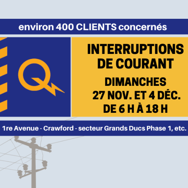 À noter que toutes les personnes (résidents, résidentes, commerçants et commerçantes) touchées par cette interruption seront avisées au moins 72 heures à l’avance au moyen d’un message téléphonique automatisé confirmant la date et l’heure des travaux. Si les conditions climatiques sont difficiles, les travaux du 27 novembre pourraient être reportés au 4 décembre et les travaux initialement prévus le 4 décembre pourraient être reportés au 11 décembre.